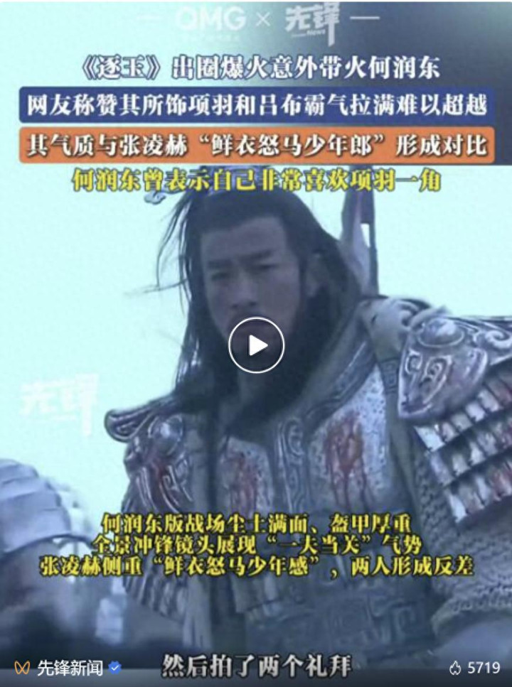 何润东在2012年《楚汉外传》中扮演的项羽,因近期新剧《逐玉》热播未必翻红,网友奖饰何润东献技了项羽的霸气值拉满。何润东版战场尘土满面、盔甲沉静,全景冲锋镜头展现“一夫当关”声威,张凌赫侧重“鲜衣良马少年感”,两东谈主酿成反差。