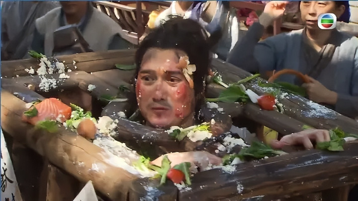 剧中他被路东谈主用生鸡蛋、菜心、番茄、豆腐等砸中,还被生三文鱼片呛死。